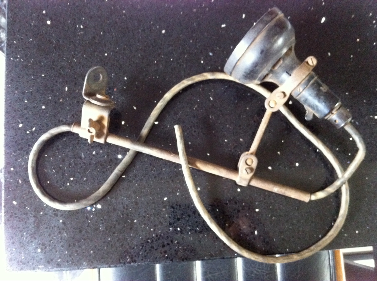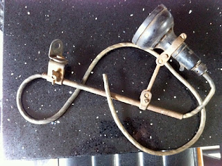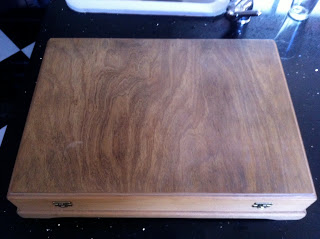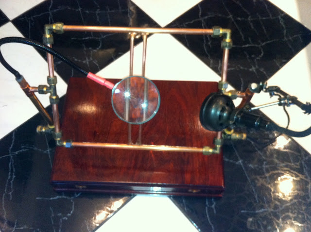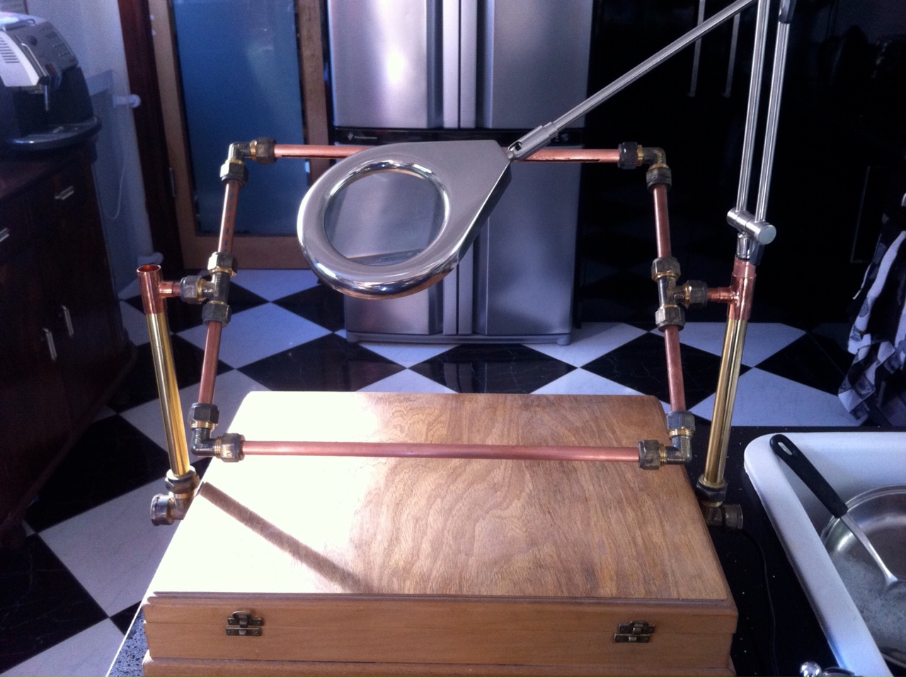 The box is an old cutlery canteen which has been well sanded. The magnifying lamp was a component from my old table lamp (minus the base). The frame and uprights are brass and copper. pieces I have rescued from various plumbing projects.