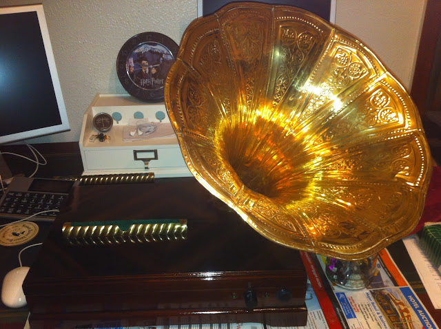 So…….this is what I have been working on. It has a 50 watt amplifier which I built from a kit (discarded by someone), a 50 watt speaker under the embossed brass horn which can handle a 100 watts of power and to finish this off, I am installing a tone control.