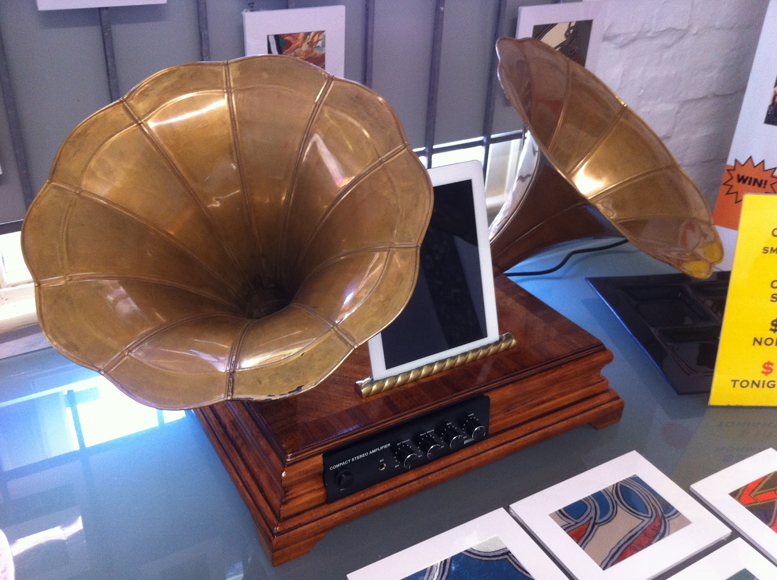 We’ll be selling steampunk artefacts I make. Steampunk iPhonographs, Sir Round-A-Sounds and a few other choice pieces! So I have been very busy creating new pieces for our opening which happened on Friday 24th August 2012.