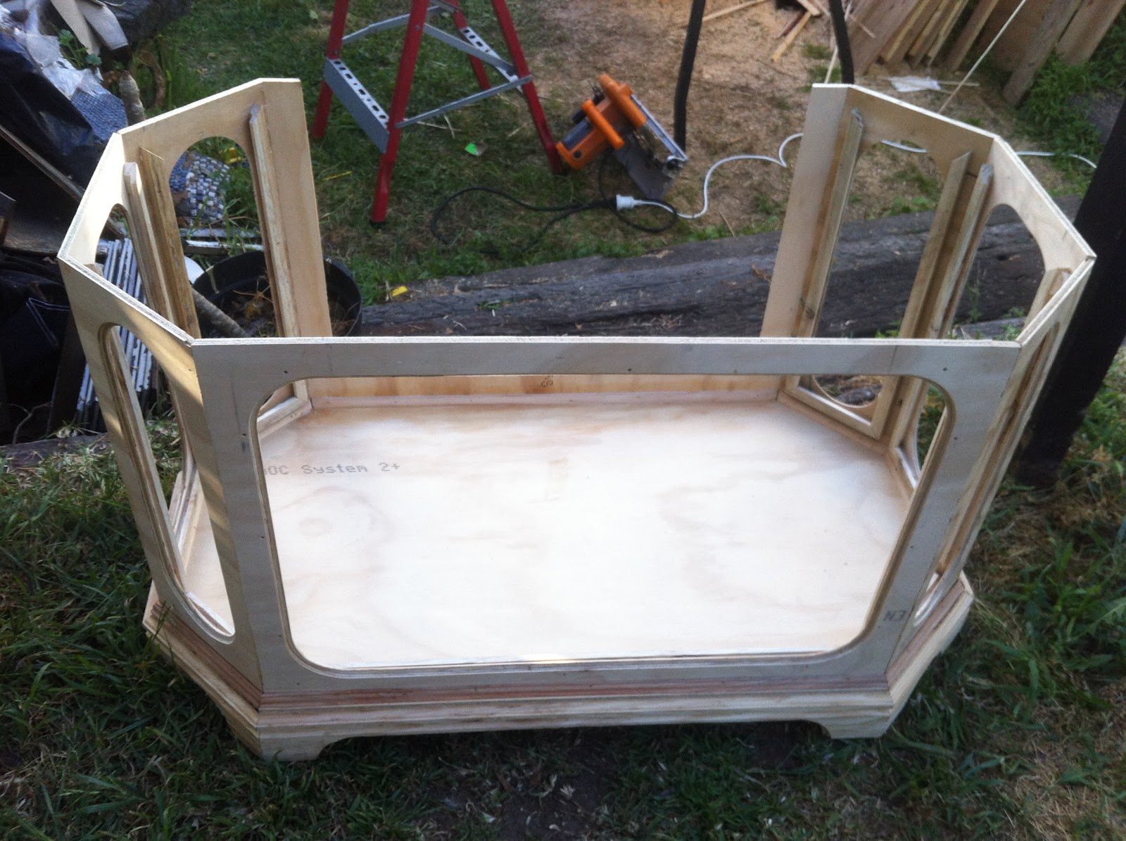 Apart from all 8 tall sides being made of glass, it will have small, round glassed in peeper windows in the pitched roof, speaker holes and lighting. Here is a glimpse of its beginnings.