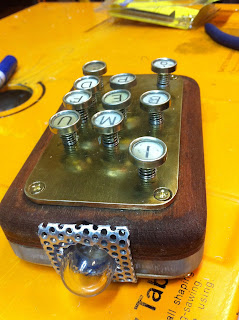 Apart from the fact that the Steampunk Remote Control wood exterior still needs a few more coats of varnish and the brass needs polishing, this remote control works with my Steampunk sound system. And fits into the palm of your hand. A nice chunky handful with tactile typewriter buttons.