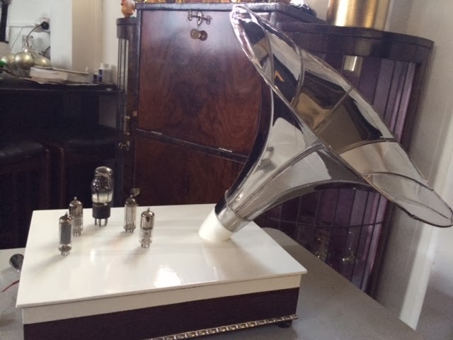So I just wasn’t feeling the full mahogany stain job on the iPhonograph ‘Chrome’. If it were for anyone other than my two dear friends, I may have left it but…knowing their joint penchant for a reasonably pared back, modern aesthetic with a bent towards big white dinner plates combined with original art, I went with painting the top of the cutlery box that houses the audio workings a vivid white. It had to be super smooth – working out the brush marks was quite a challenge.